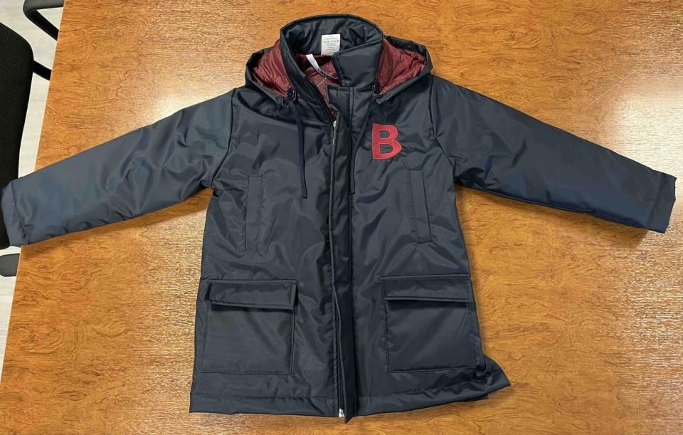 Abrigo de invierno con los colores del colegio Británico de Aragón. Fácil de limpiar y resistente. Colores rojos y azul marino. 90% POLIESTER 10% POLIURETANO